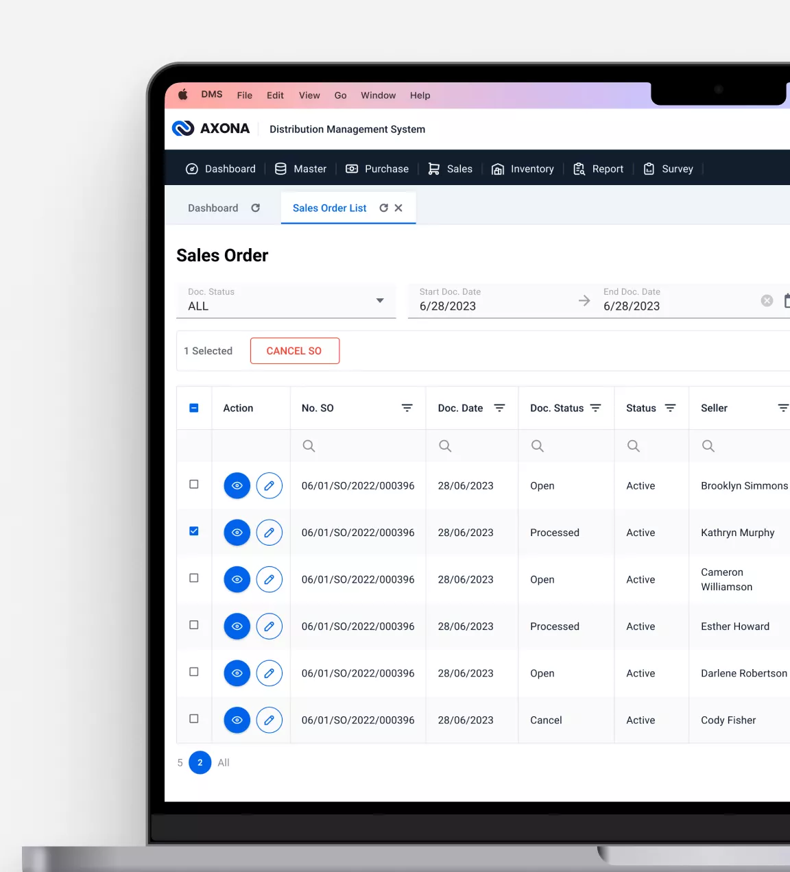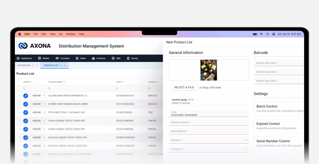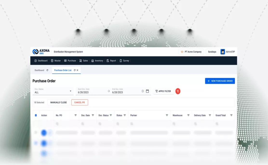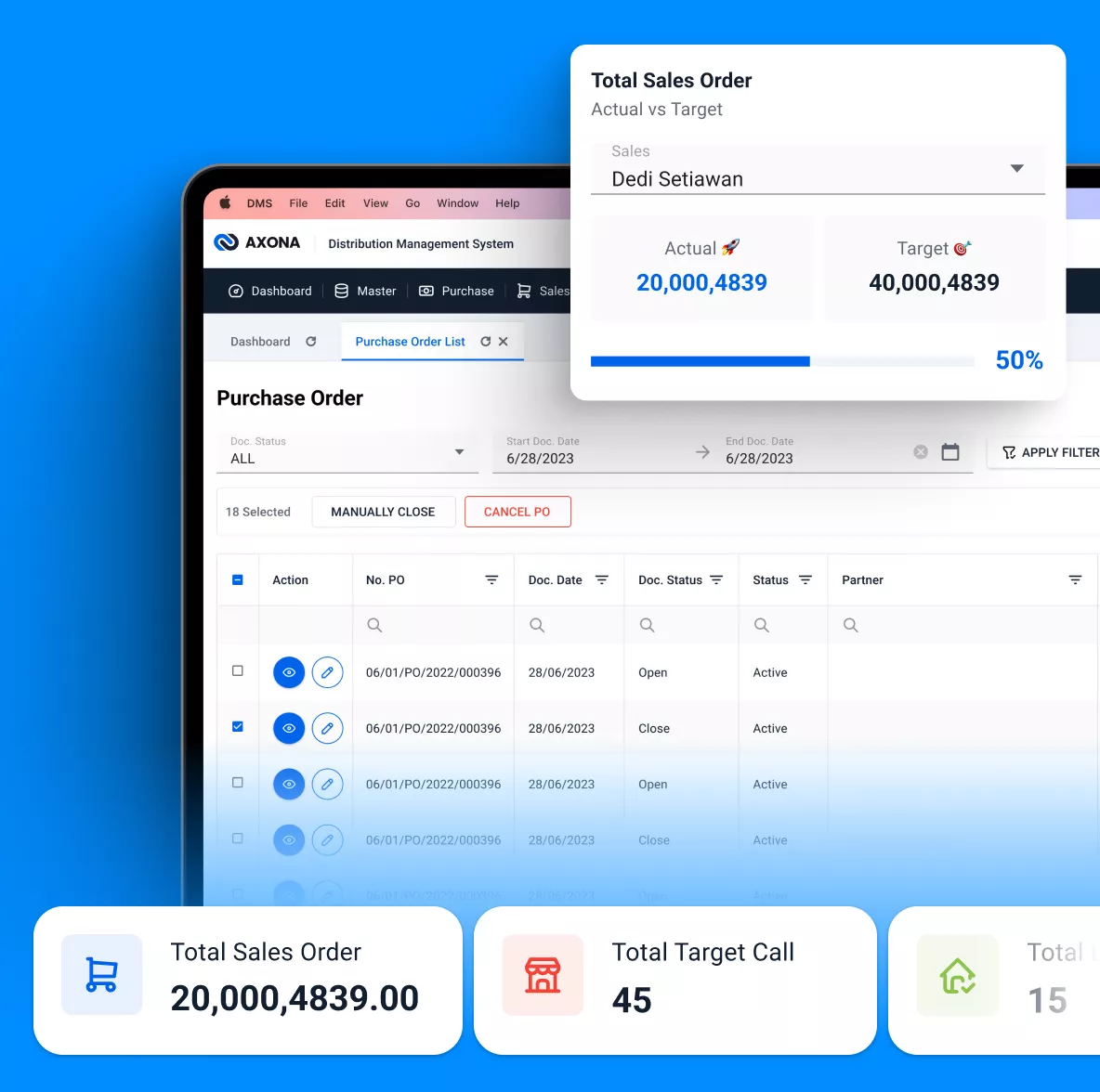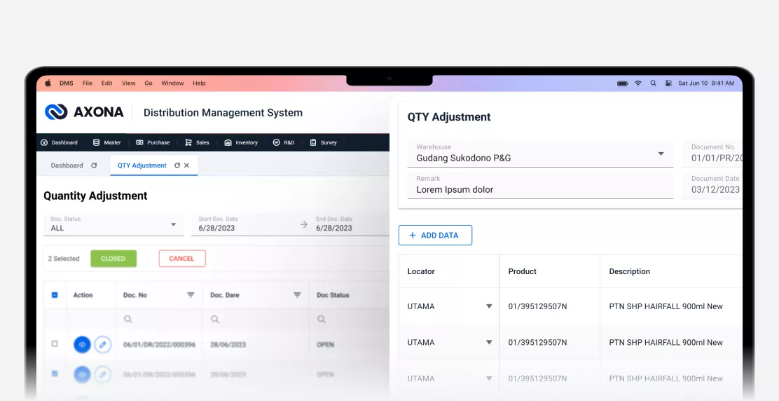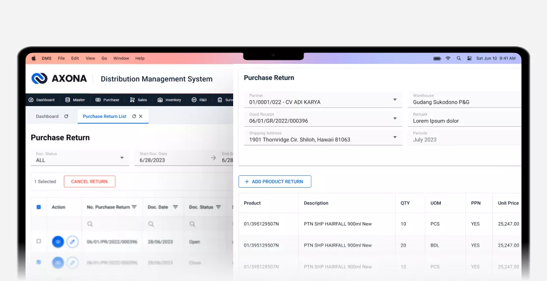 Dari purchase hingga sales return, Axona DMS memberikan kendali penuh