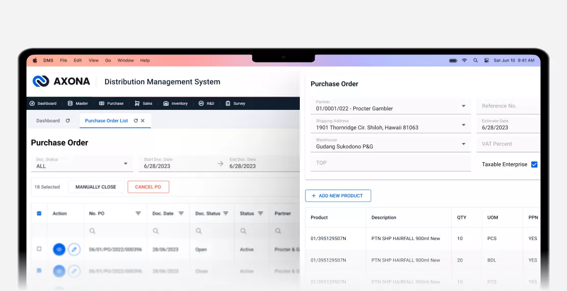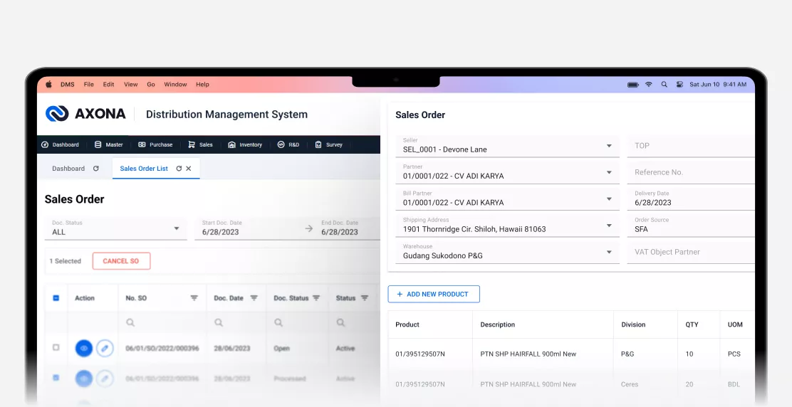 Axona DMS membantu bisnis mengelola proses distribusi secara end-to-end, dari sales order, purchase order, hingga return dan inventory management dalam satu sistem terintegrasi.